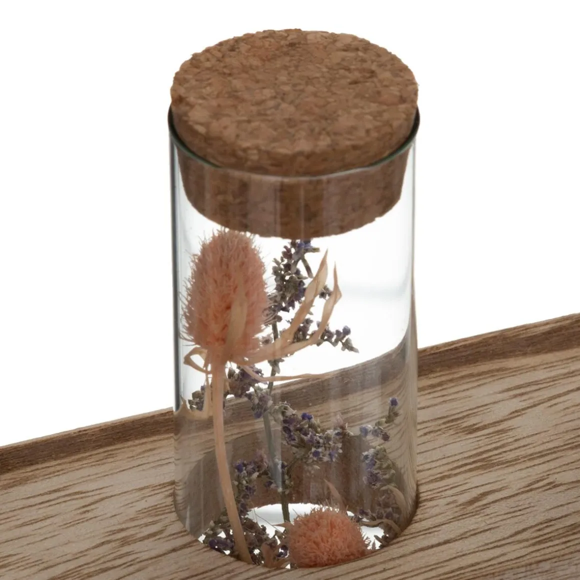 Un support rectangulaire en bois patiné maintient les tubes en place et ajoutera du charme à votre espace. Les tubes sont garnis de compositions florales variées qui éveilleront la curiosité. Le mix des matières entre le verre transparent et les bouchons en liège offre un rendu chaleureux.
