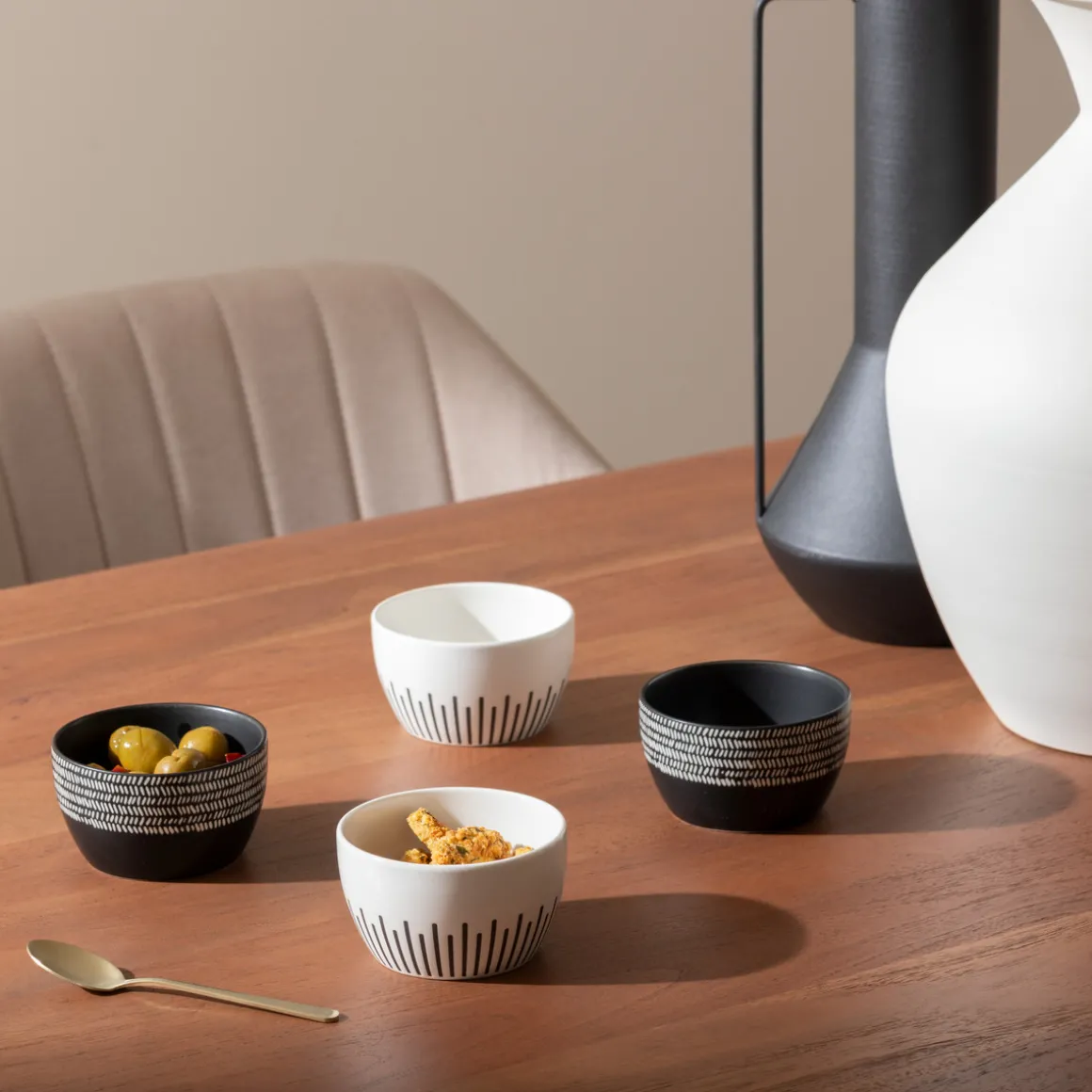 Les 4 coupelles « Ethnique » sont des bols alimentaires compatibles avec un lavage au lave-vaisselle ainsi qu’avec le passage au micro-ondes.