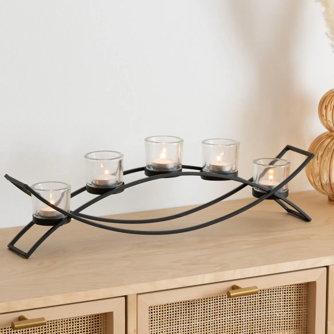 Ce photophore se démarque par son support métallique symétrique. Ce dernier accueille 5 contenants en verre adaptés à des bougies chauffe-plat. L’ensemble est idéal pour créer une ambiance empreinte de romantisme.