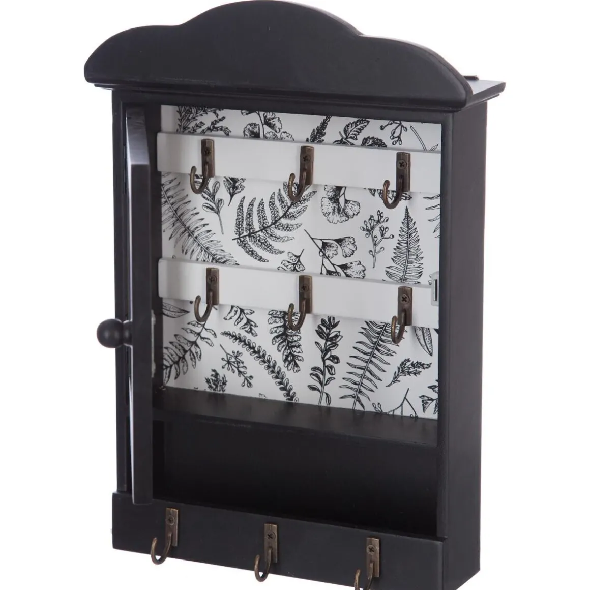 Vous apprécierez le design pratique de cette boîte à clés en bois peint et décorée d’un fond imprimé. Cette boîte à clés « Beau manoir » comprend 3 crochets externes, un vide-poche et 6 crochets protégés par une porte vitrée aimantée.