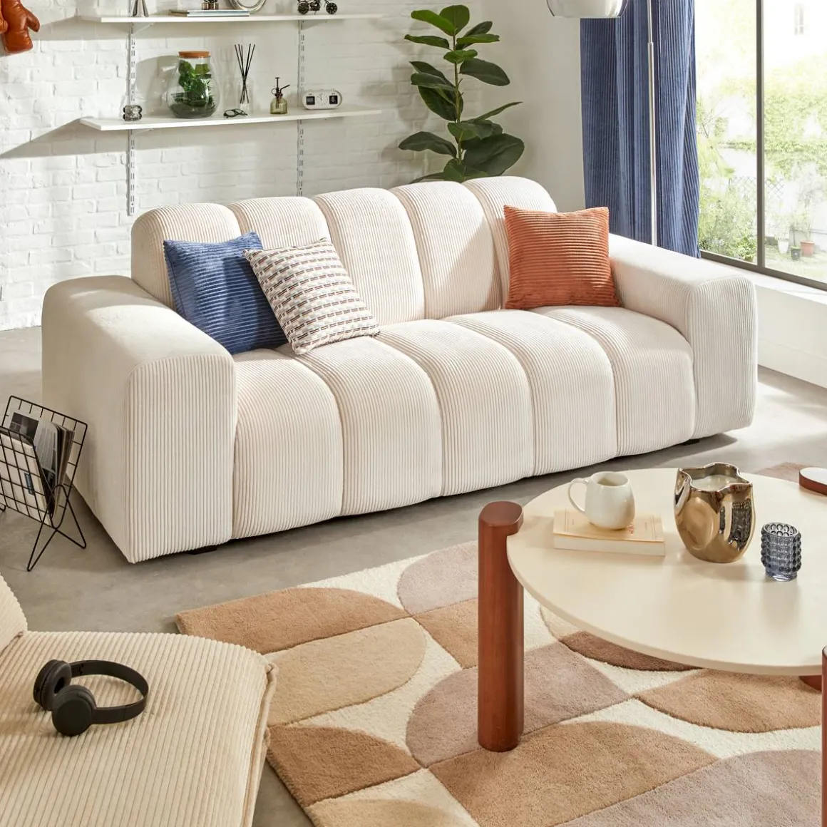 De plus, son tissu certifié Oeko-Tex® est très agréable au toucher. Une table basse et un meuble Tv Atmosphera en bois ou en métal viendront compléter joliment votre canapé fixe Palma.