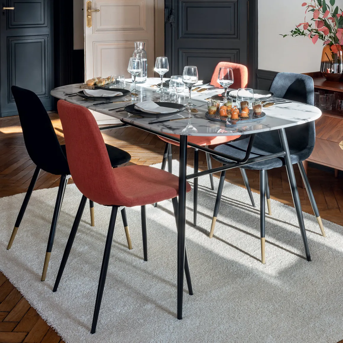 Cette chaise accompagnera parfaitement une table de salle à manger en verre ou en marbre Atmosphera.