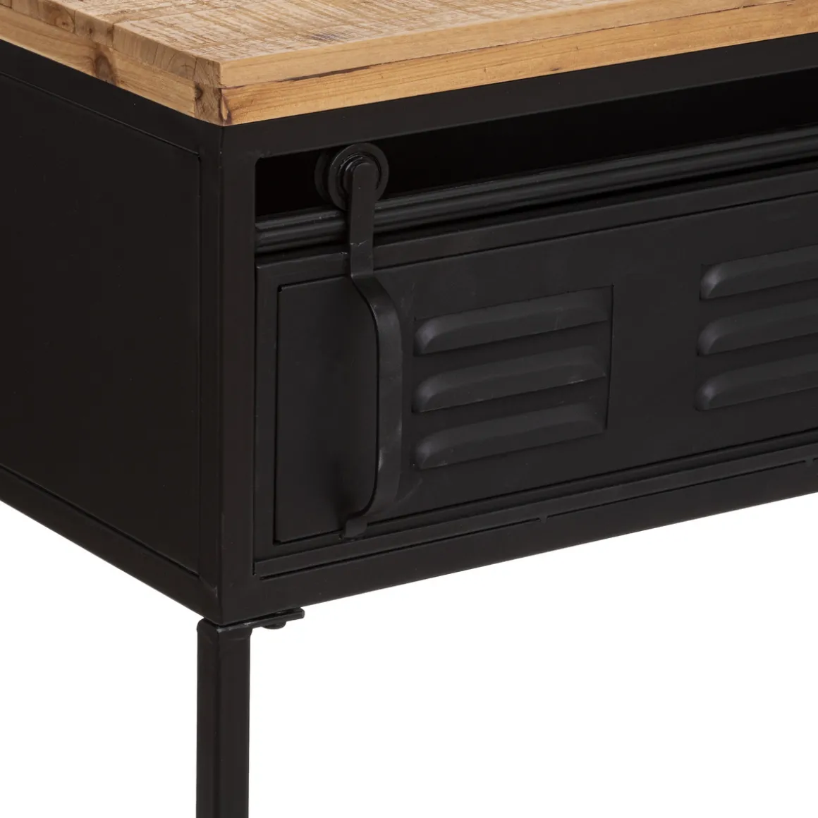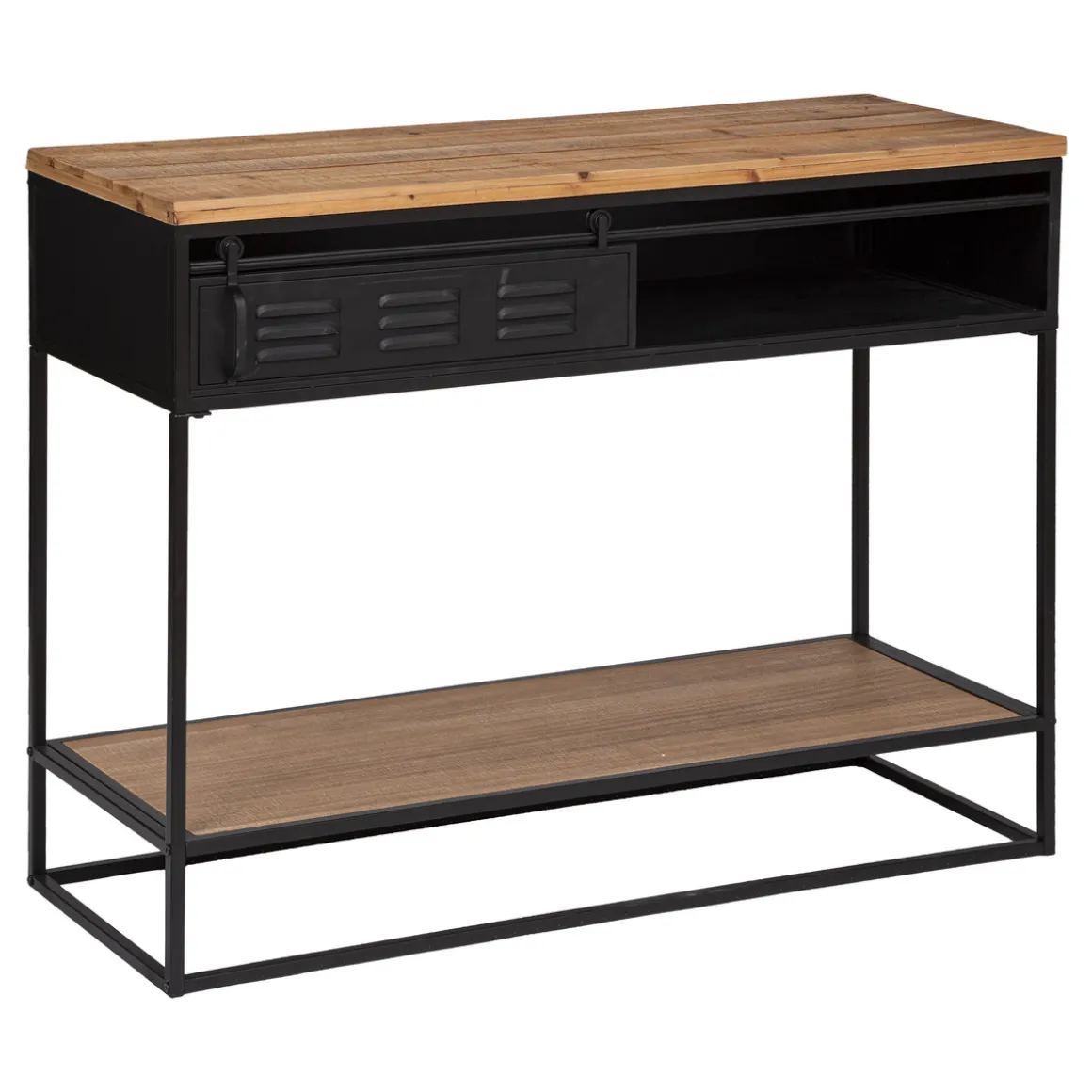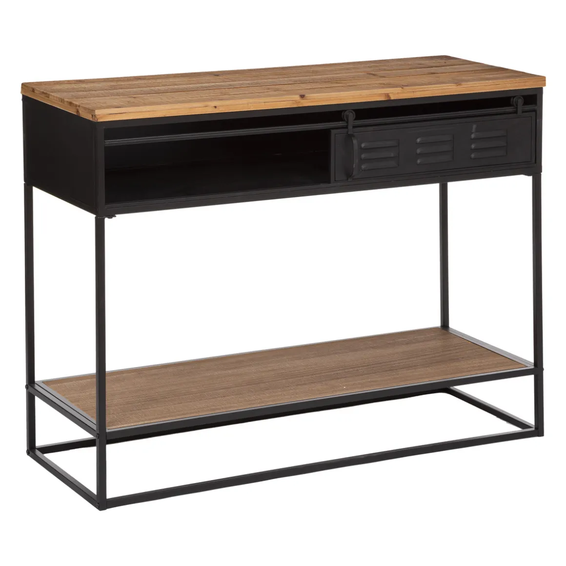 Cette console allie joliment une structure en métal avec des plateaux en bois. Ce mix des matières lui donne une allure résolument industrielle. Ce meuble possède plusieurs rangements comme un large renfoncement sous le plan de travail et une grande étagère inférieure.