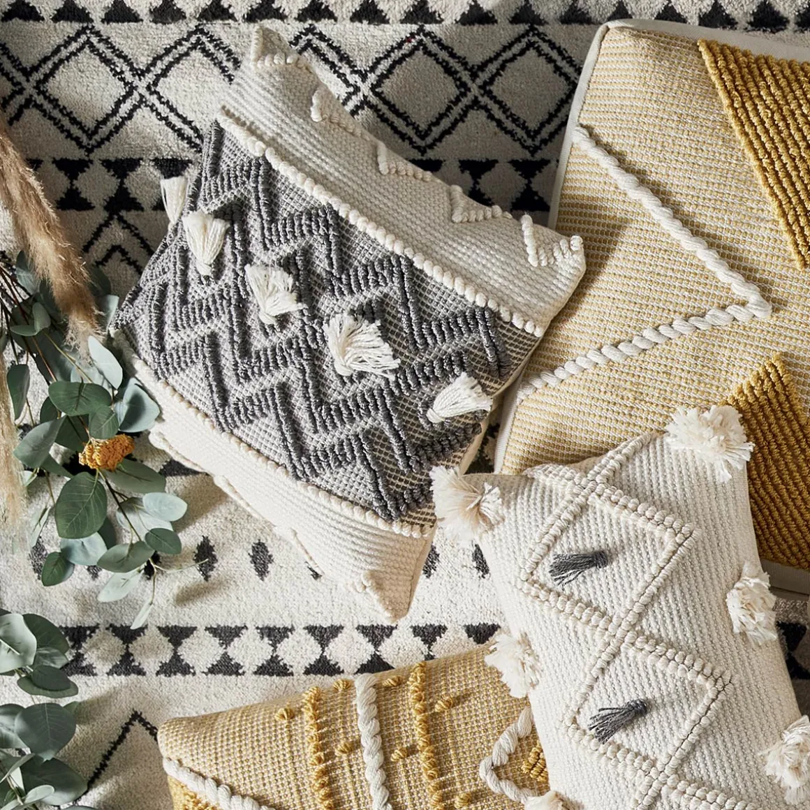 Pour un salon à l’ambiance gipsy, ce coussin s’associe idéalement à un lit banquette en rotin Atmosphera.