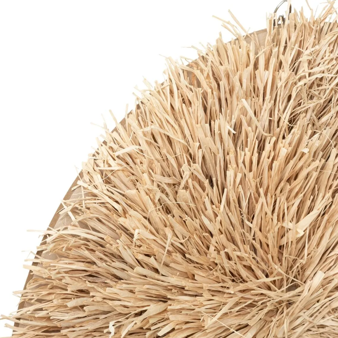 Le disque façon bois frangé de raphia de cette décoration murale surprend par sa singularité. Elle évoque l’artisanat des contrées hispaniques ensoleillées.