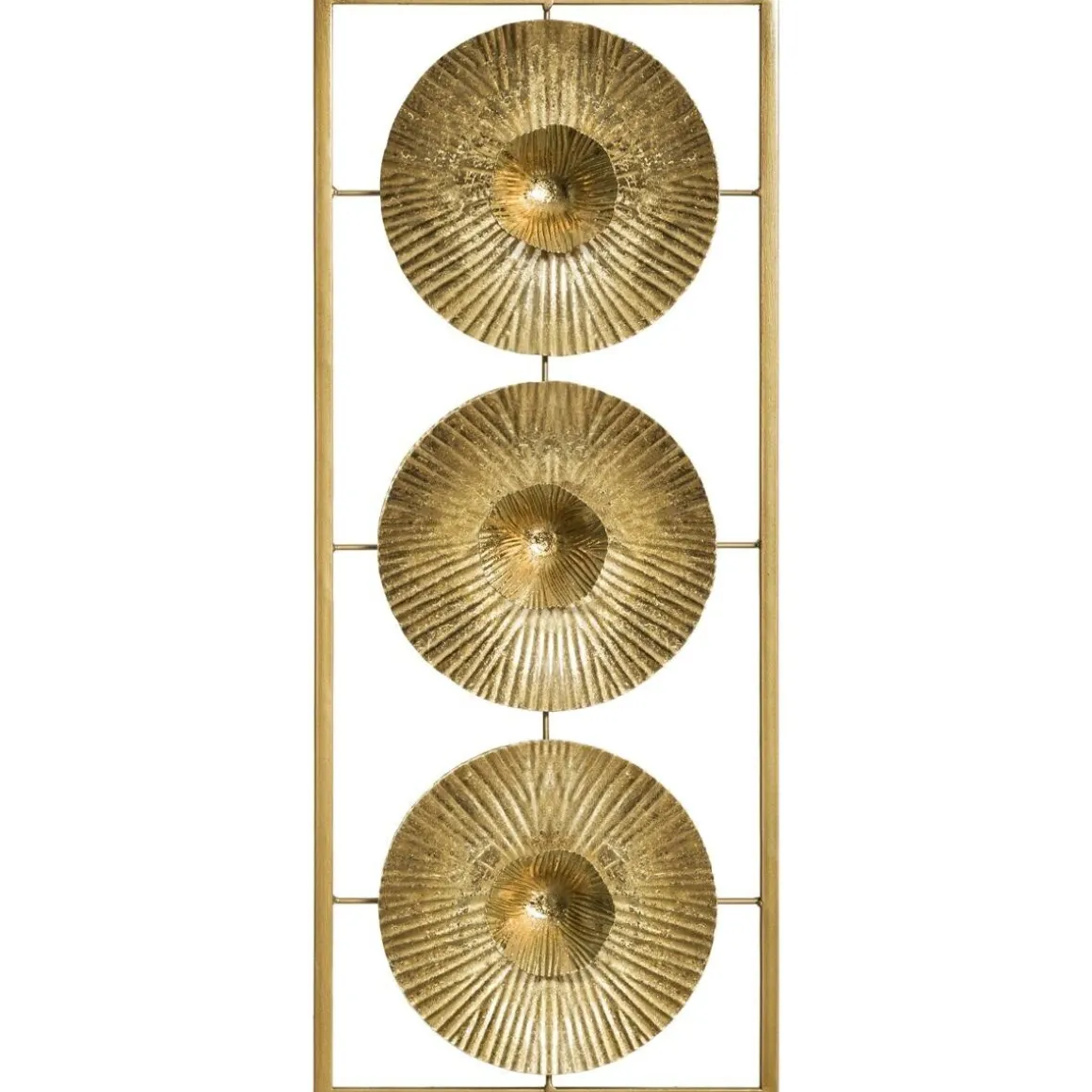 Trois disques légèrement ondulés sur lesquels se posent des corolles centrales. Un cadre rectangulaire. Le contraste de ces formes crée une unité artistique au style contemporain affirmé. La patine de la peinture accentue le caractère élégant de cet élément d’ornement, et lui donne un côté vintage.