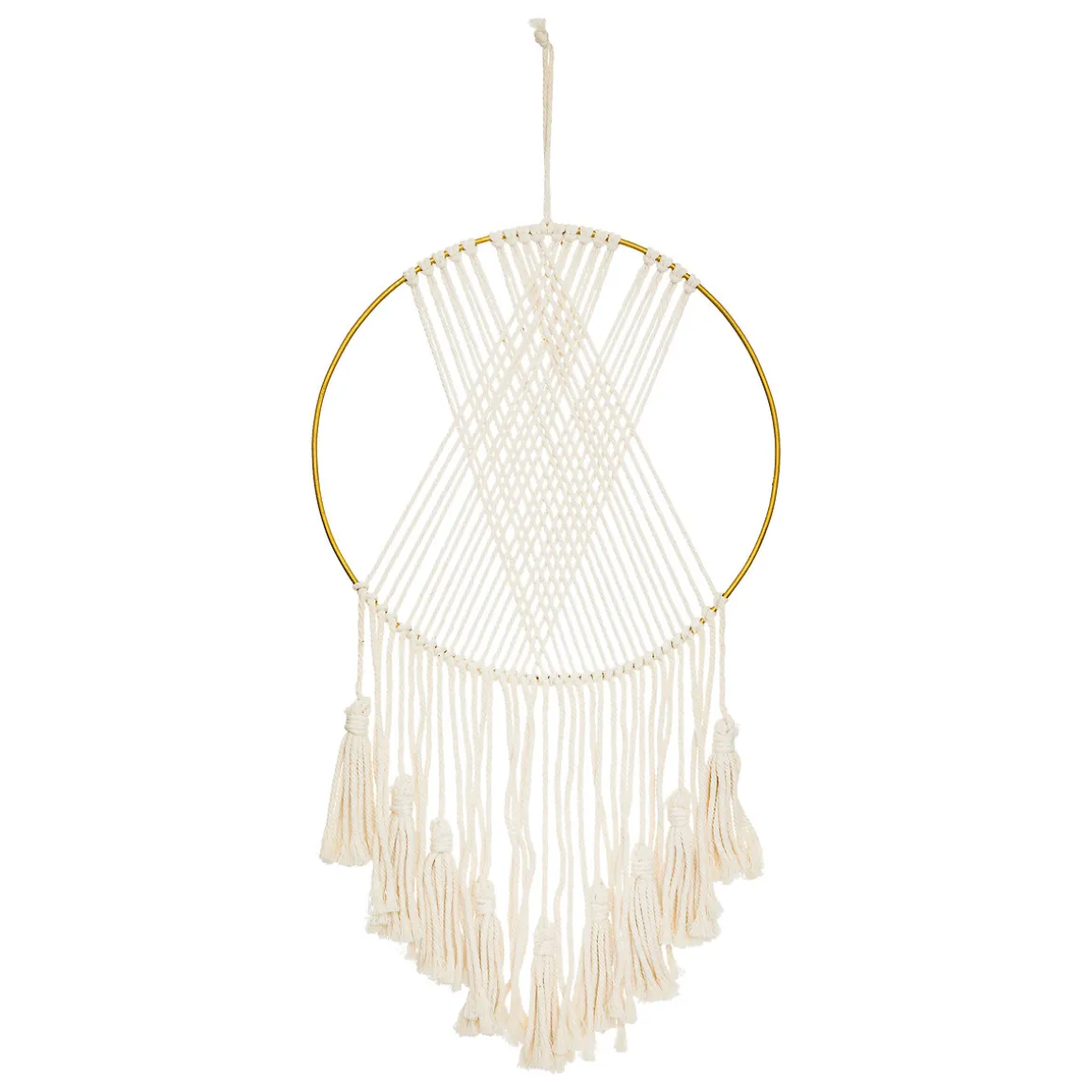 Réalisée en macramé et montée sur une structure métallique, la déco murale « Soline » obéit à des dimensions harmonieuses et déposera une touche chaleureuse dans votre univers, associée à du mobilier en bois ou en rotin. Simple et épurée, elle sera du plus bel effet au-dessus d’une tête de lit ou d’une console dans une entrée.