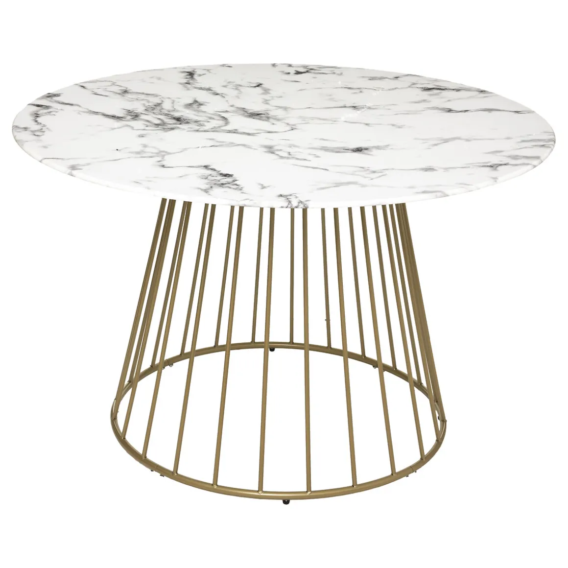 La table à manger Rayo, avec sa base en fer conique et son plateau en verre trempé effet marbre, apporte une note chic et contemporaine à votre intérieur. Les chaises Roka, avec leurs pieds obliques en acier effet bois et leur assise rétro, complètent parfaitement cet ensemble.