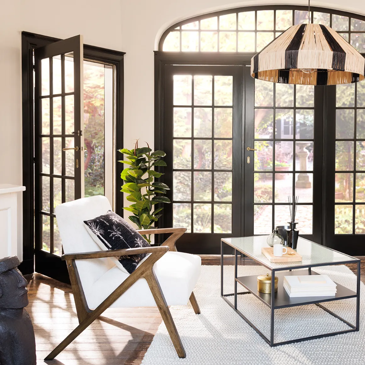 Pour une ambiance cosy, ajoutez un grand tapis rectangulaire, un plaid tout doux et un coussin moelleux.