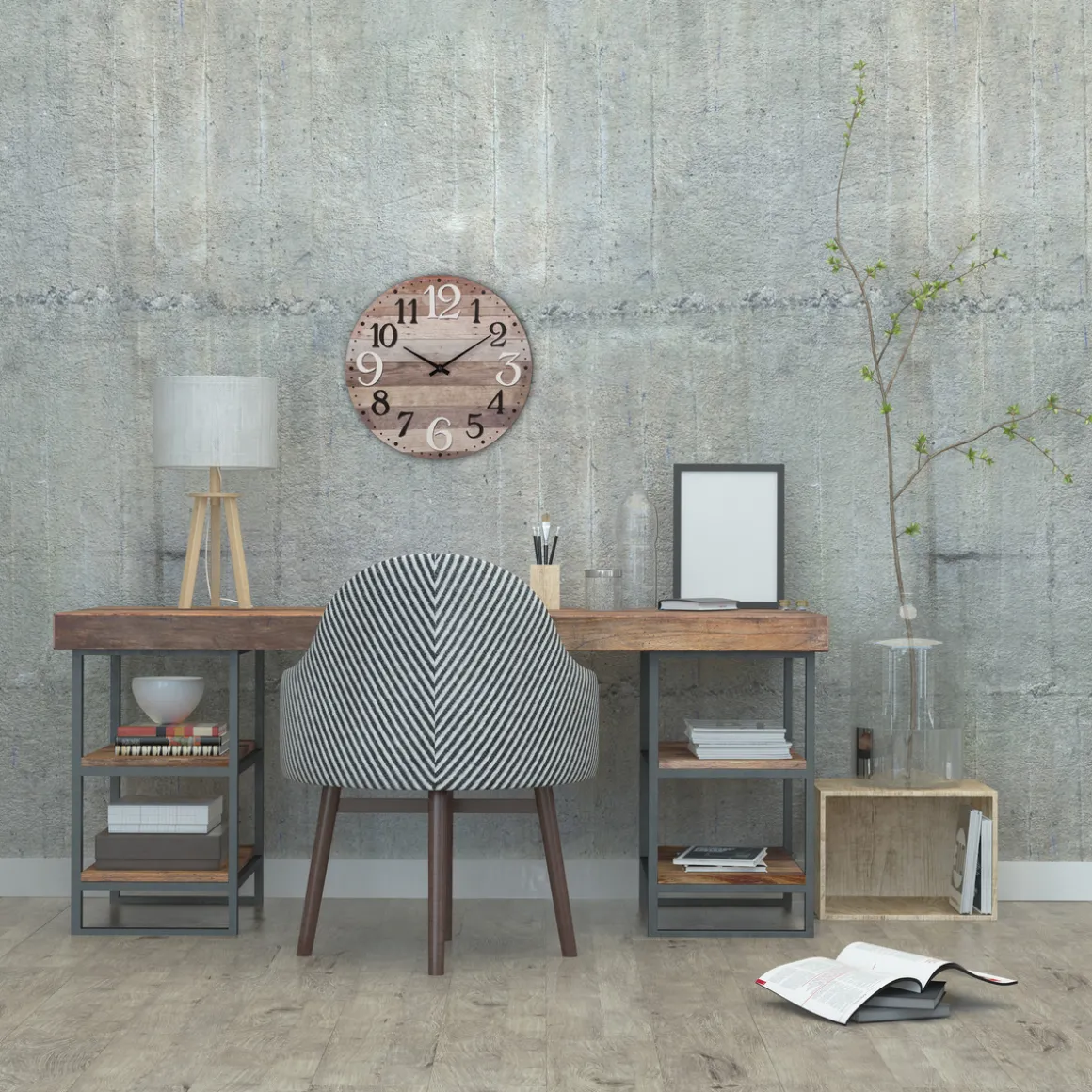 Fixez votre horloge au-dessus d’un bureau en bois et métal Atmospherapour créer un ensemble chaleureux et intemporel.