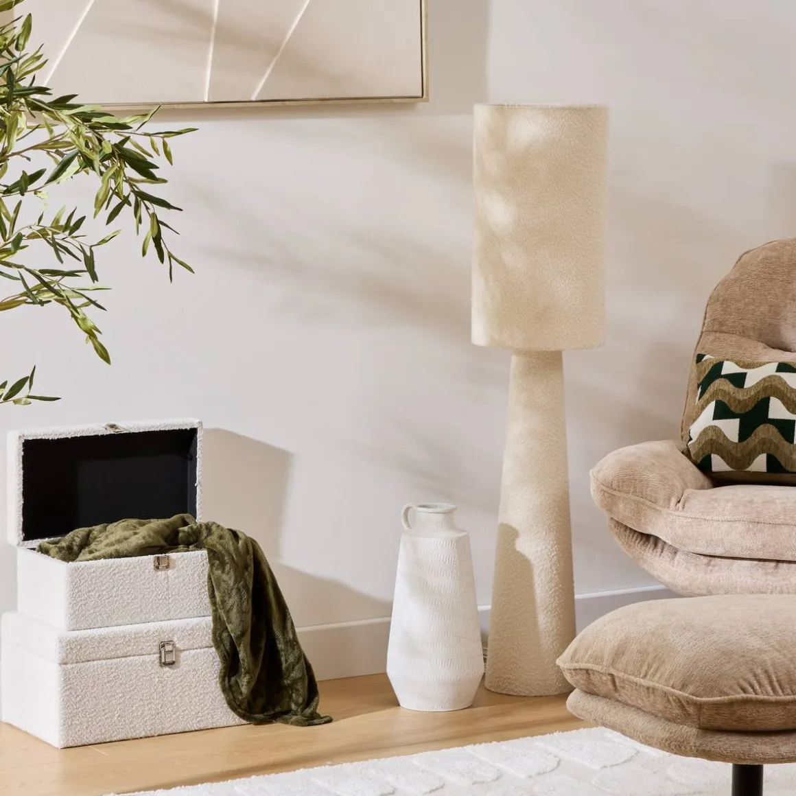 Idéal dans un salon comme dans une chambre à coucher, le lampadaire droit Solal Atmosphera joue sur un design simple et intemporel. Son abat-jour cylindrique et son pied conique sont revêtus de tissu au fini texturé et l’ensemble est proposé dans un coloris naturel très facile à marier. L’abat-jour est équipé de deux dOUIlles afin d’accueillir deux ampoules qui produiront une lumière conviviale, éclairant ainsi une partie de la base. Choisissez vos ampoules en fonction de l’intensité voulue et associez ce lampadaire à un tapis Atmosphera en matière naturelle. Complétez avec quelques objets déco au style artisanal pour harmoniser votre univers.