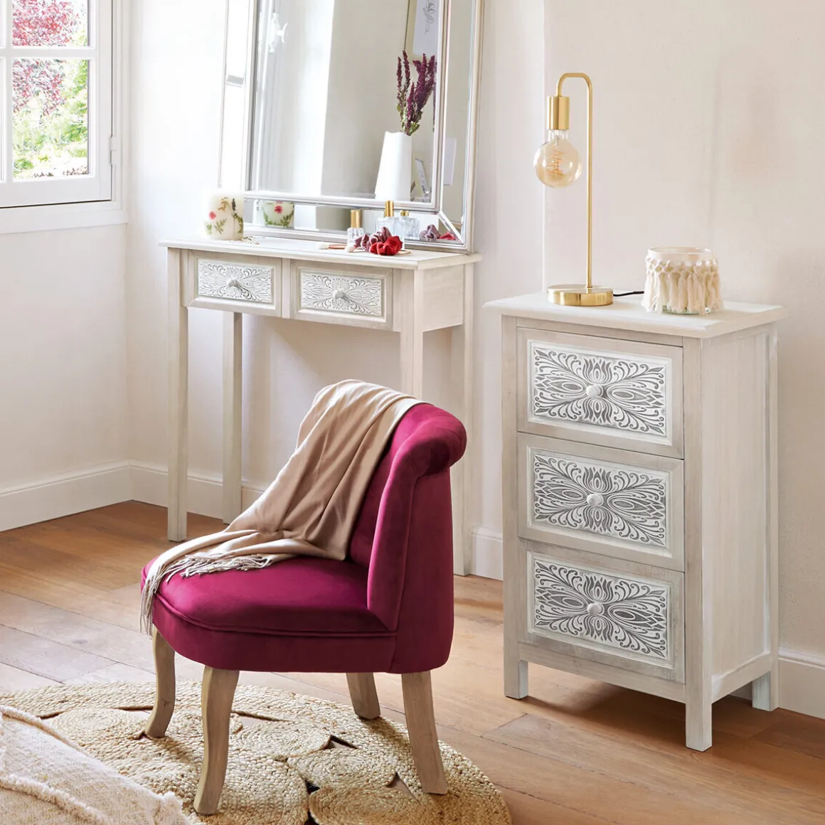 Si vous souhaitez éviter le total look moderne, vous pourrez mixer les styles en associant la lampe droite « Keli » à des matières plus vintage comme le velours. Pourquoi pas en installant un canapé Atmosphera ?