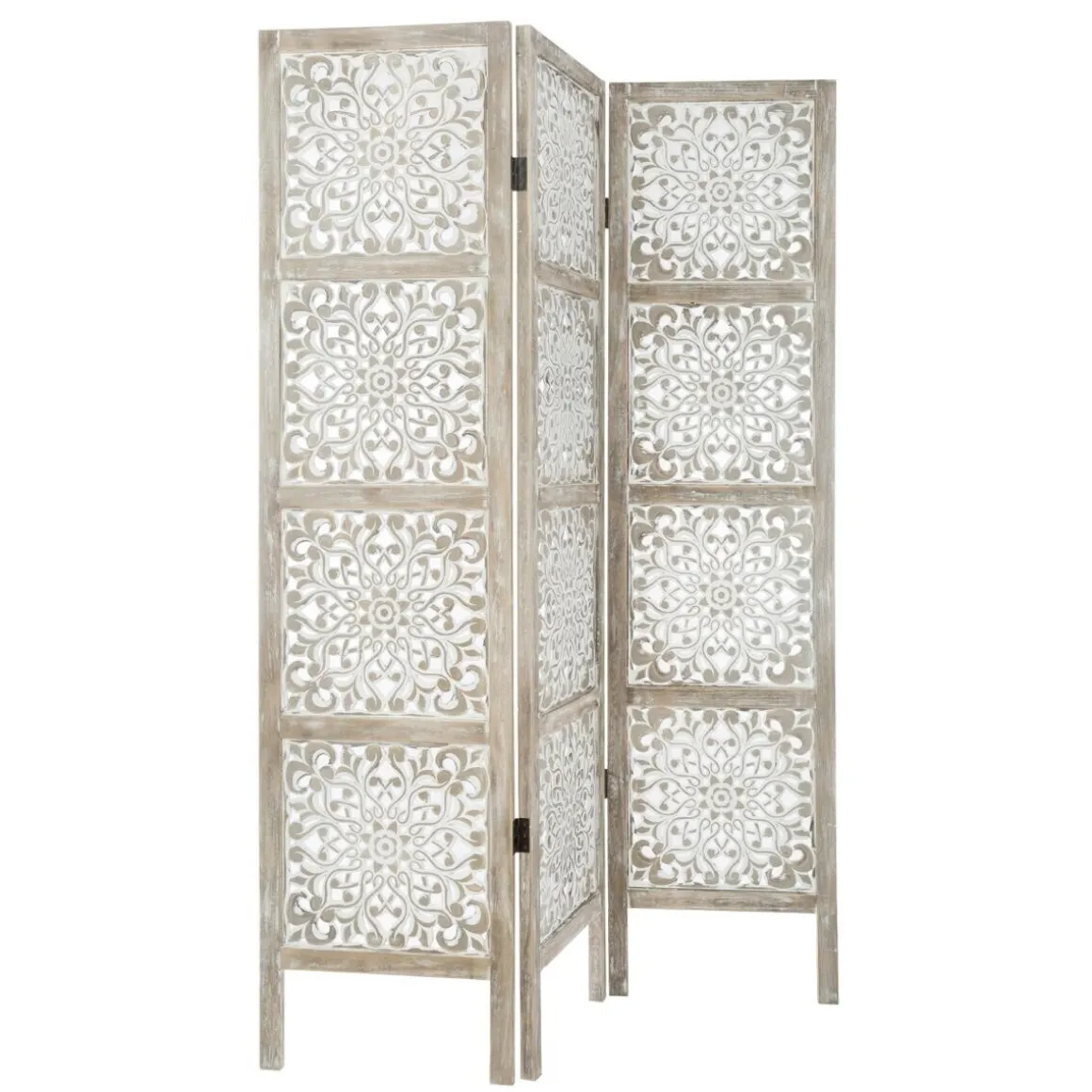 Ce paravent est pratique pour délimiter l’espace et structurer le volume dans la pièce de votre choix : chambre à coucher, salon, etc. Il s’offre une finition blanchie façon bois cérusé qui sublime ses trois panneaux aux motifs venus d’ailleurs.