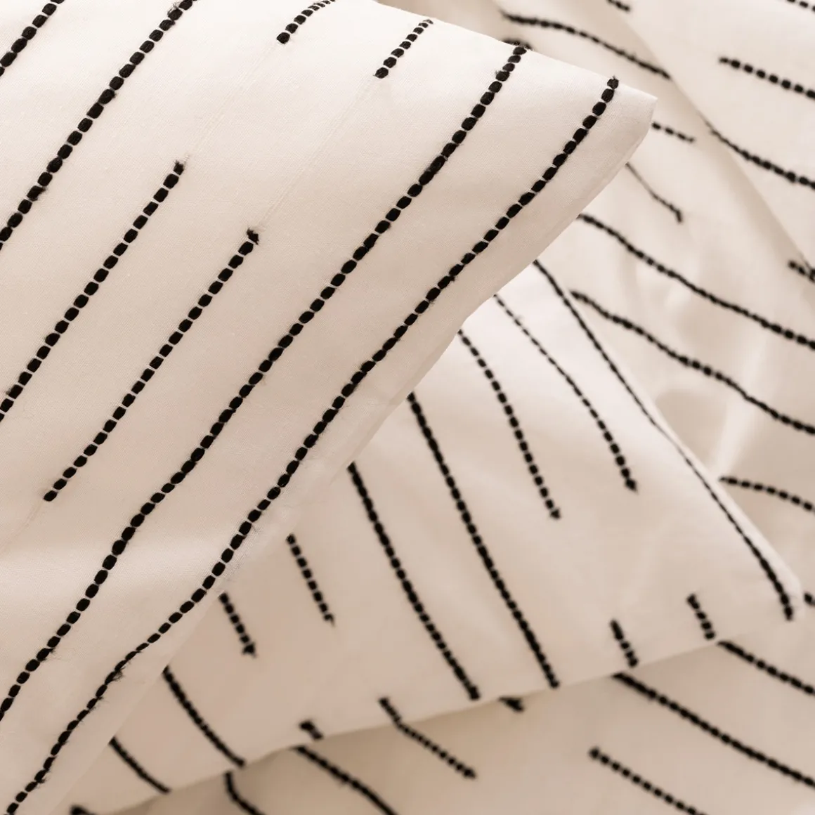 La parure de lit « Kain » comporte une housse de couette accompagnée de deux taies d’oreiller carrées. Confectionnée en coton, elle se nettoiera facilement en machine à laver. Par ailleurs, elle est dotée d’une fermeture à boutons.
