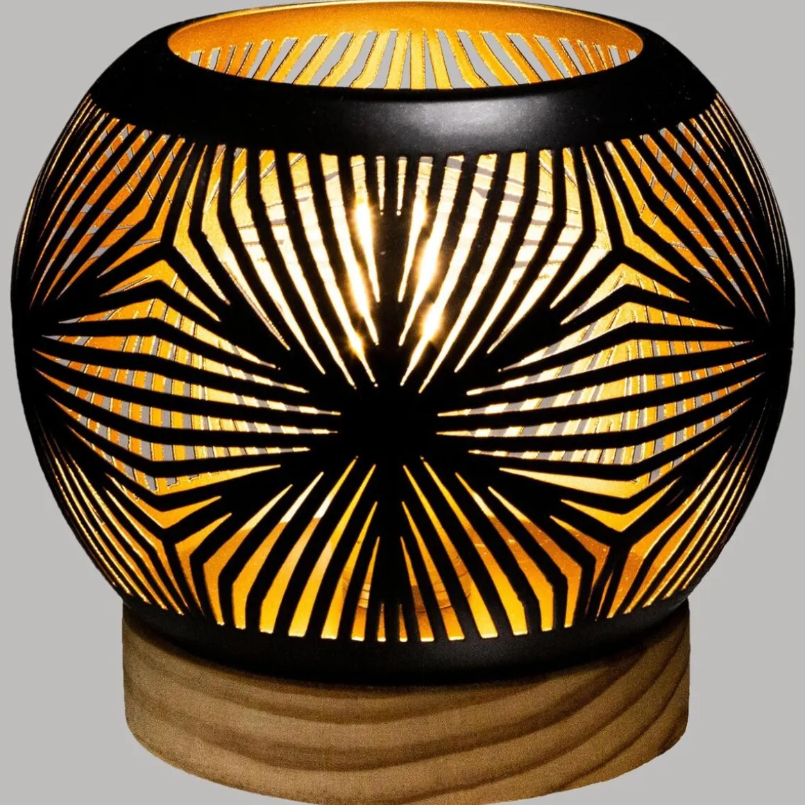 Ce photophore est composé d’une base en bois et d’une boule en métal. Celle-ci est ajourée de manière à laisser passer la lumière. L’ampoule LED intégrée fonctionne grâce à des piles. La teinte à l’intérieur de la boule apporte un côté chaleureux à l’éclairage.