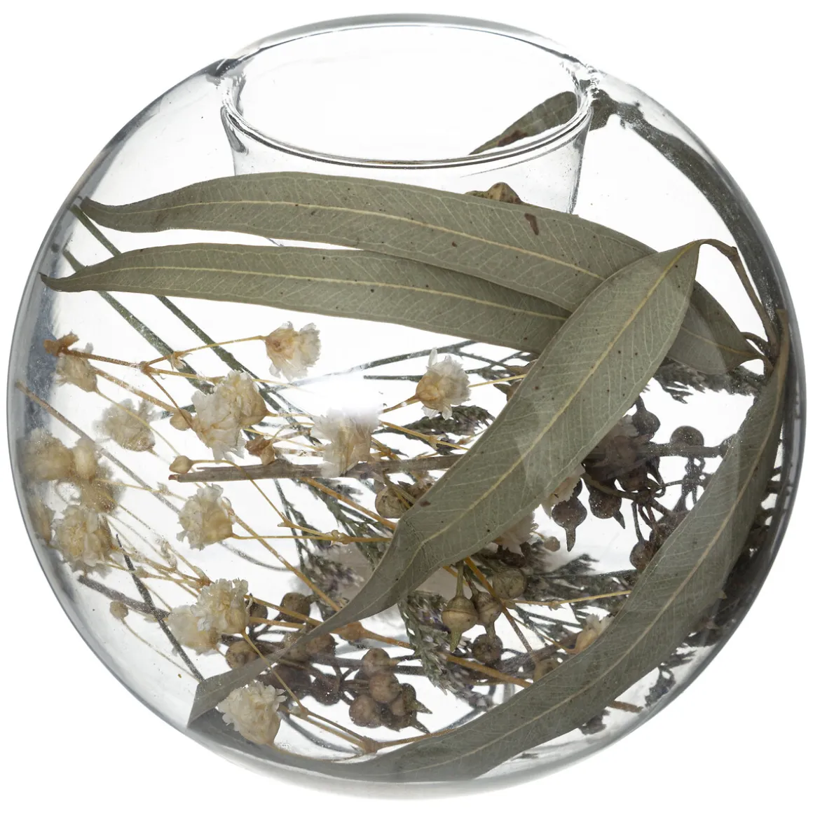 Ce photophore avec fleurs sechées « folk » est composé d’une boule en verre de 10 cm de diamètre, à l’intérieur de laquelle est disposée une sélection de fleurs séchées. Sur la partie supérieure, un emplacement cylindrique permet de poser une bougie chauffe-plat. Idéal pour créer une ambiance chaleureuse, il étonnera vos invités!