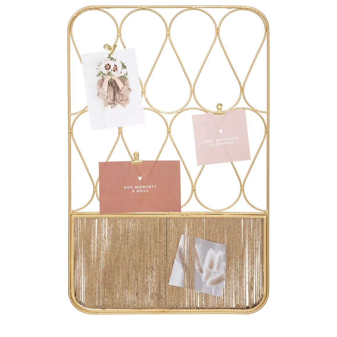 Imaginé dans un mélange de métal doré et de corde en jute naturelle, le porte-photo « Lindsay » offre des motifs délicats et des dimensions harmonieuses. Doté de 5 pinces à dessin pour fixer des photos, vous pourrez également glisser des cartes dans entre les fils de corde. Idéal pour réchauffer l’ambiance d’une entrée ou d’une chambre!