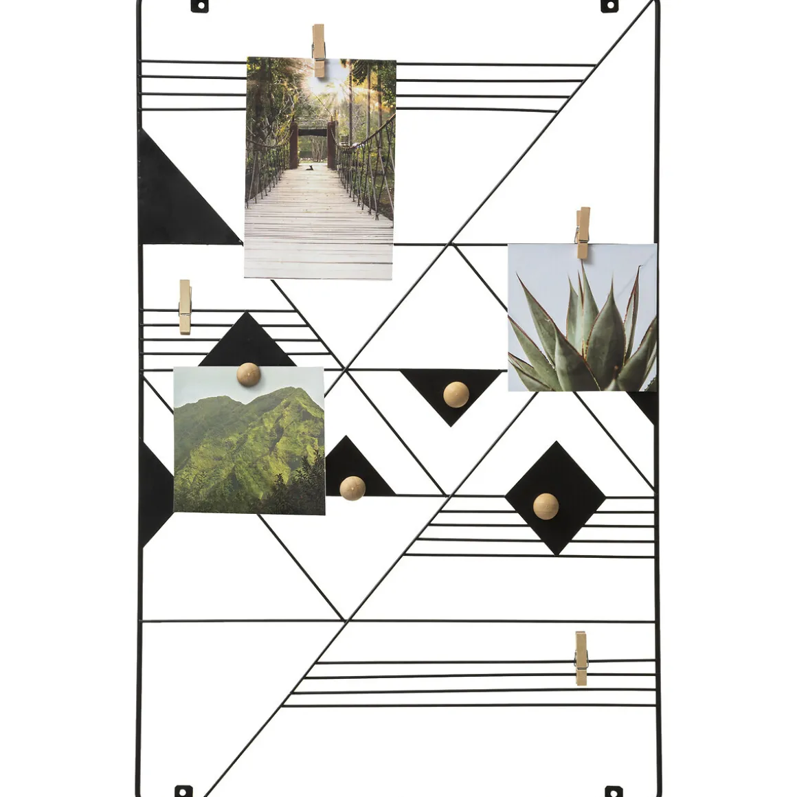 Ce porte-photos « Elora » est composé d’une structure rectangulaire en métal qui dispose de 4 accroches murales. Un enchevêtrement savant de lignes et de formes géométriques est équipé de magnets et de pinces en bois de pin qui vous permettront de fixer vos photos et cartes préférés! Simple et épuré, il décorera un mur avec un style harmonieux.