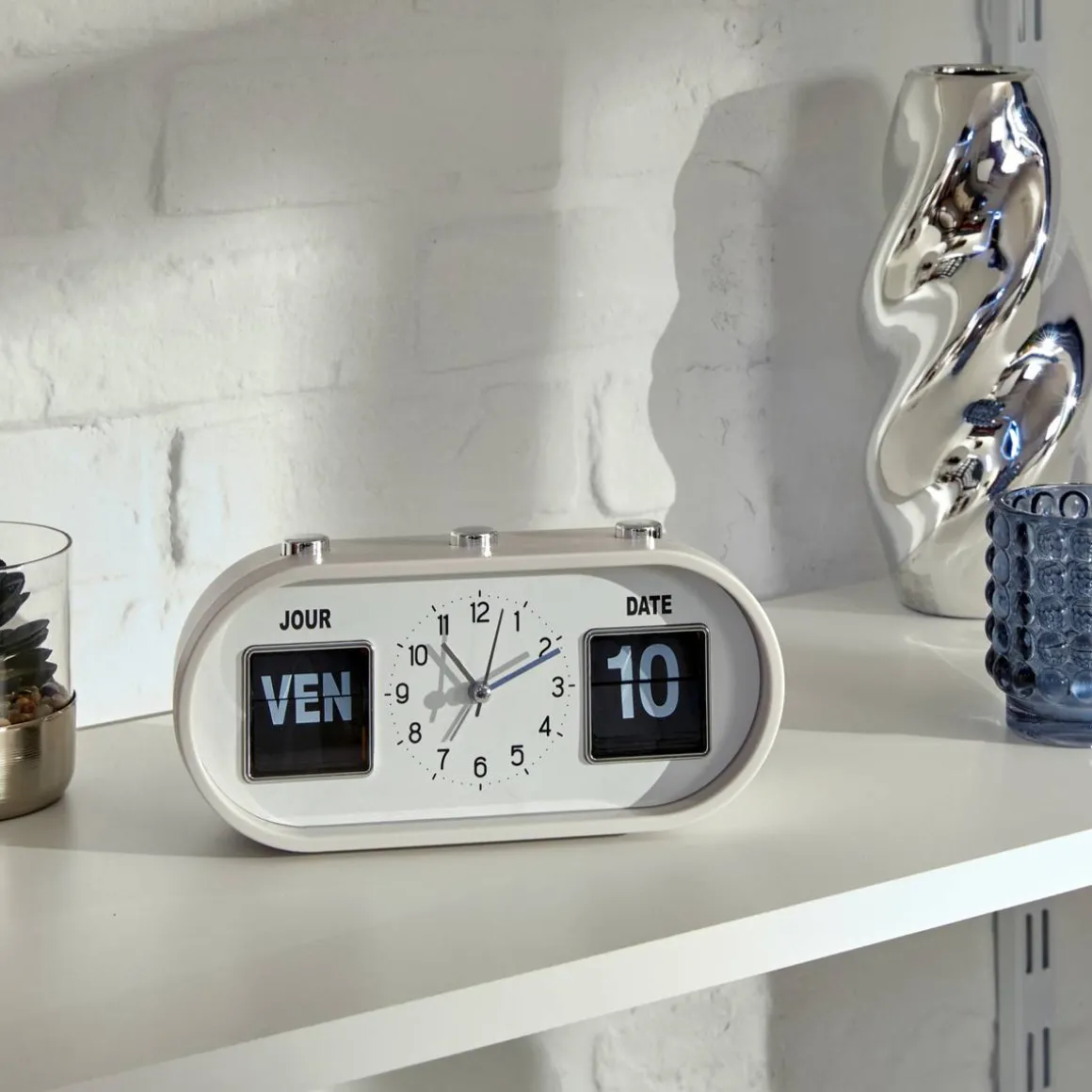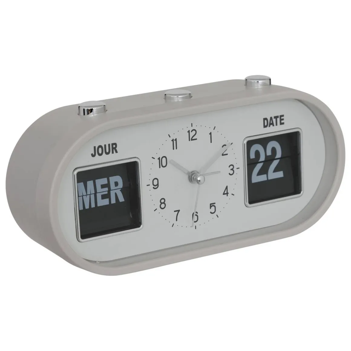 Cette horloge possède des boutons sur le dessus pour changer le jour et la date. Le cadran au centre vous permet de régler votre réveil. Cette horloge à poser Edouard trouvera sa place sur une table de chevet Atmosphera dans votre chambre.