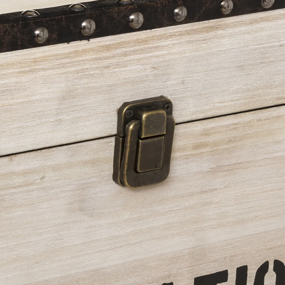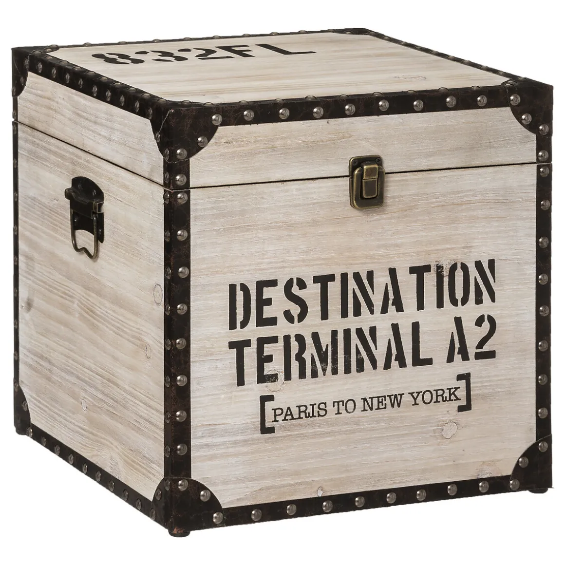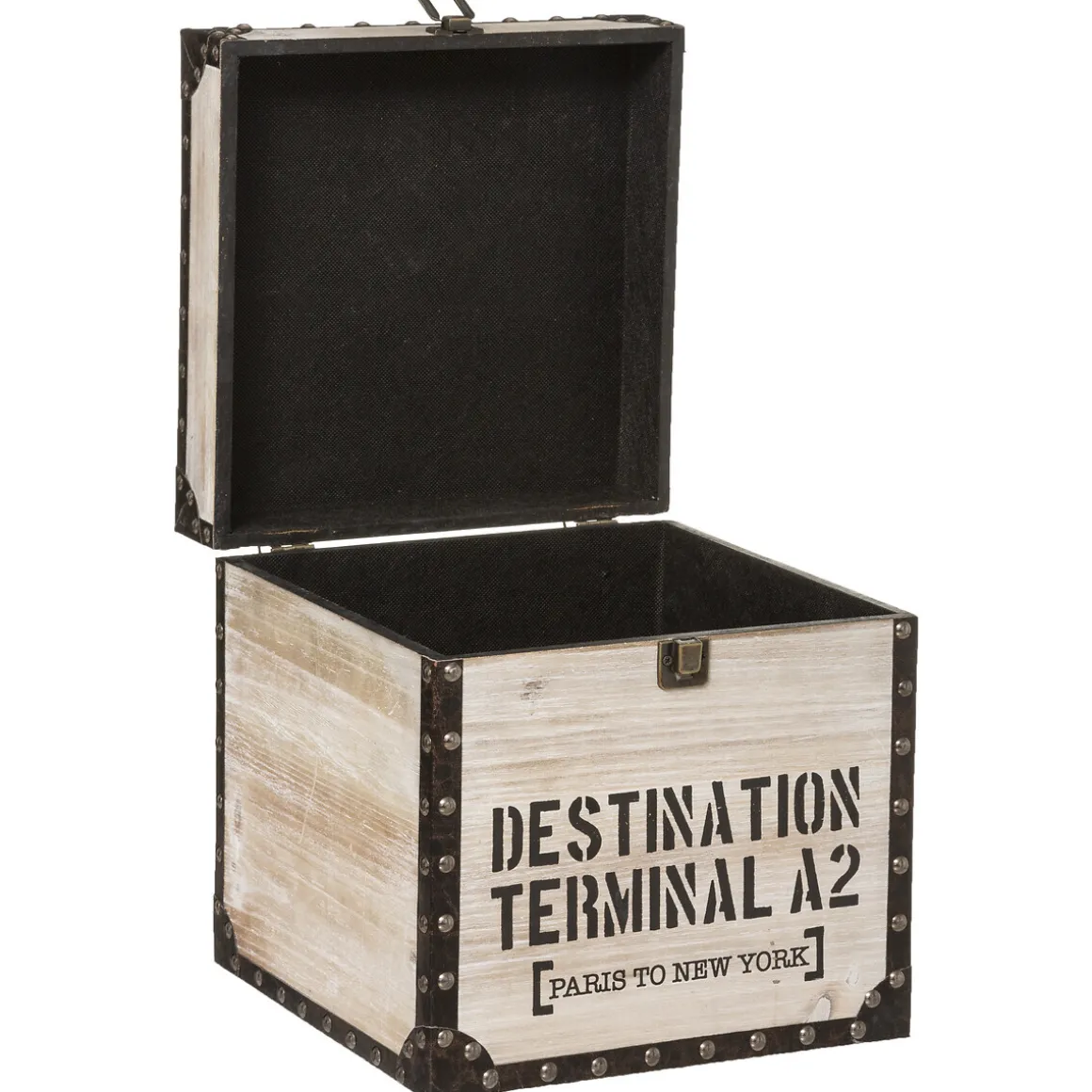 L’esprit rétro de ces 3 malles carrées « Retro Factory » est apporté par une structure en bois, des cornières en métal ornées de clous et un fermoir en fer. Elles ont de quoi charmer avec leurs inscriptions en grosses lettres qui rappellent les malles de voyage utilisées autrefois.