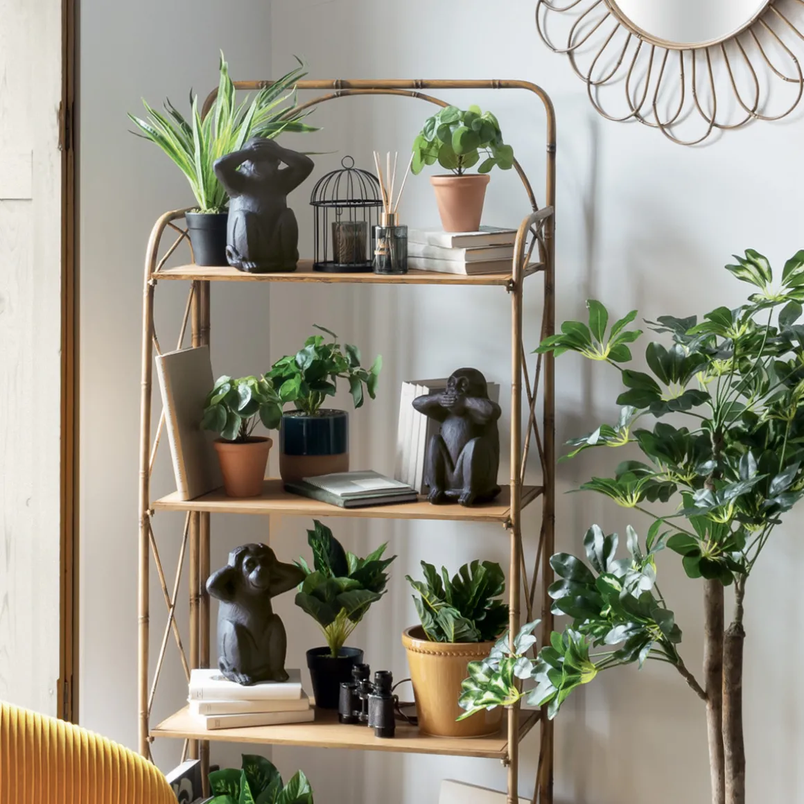 Disposez vos trois singes sur un petit buffet Atmosphera avec quelques plantes vertes.