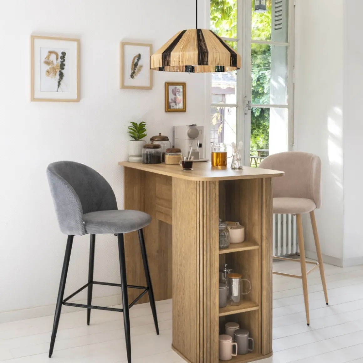 Associez votre table à manger bar « Colva » à des tabourets de bar en bois et métal Atmospherapour créer un ensemble moderne.