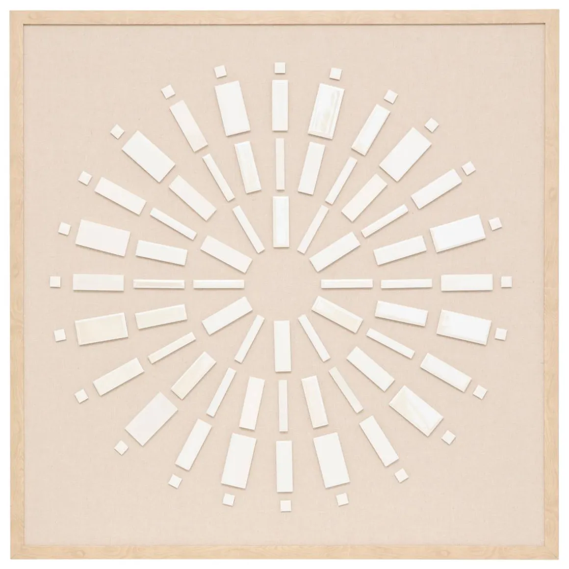 La toile en relief Houria arbore un tissu en lin qui valorise des motifs en céramique qui forment comme un soleil. Le tout est sublimé par un cadre en bois certifié FSC®. Cette toile carré donnera vie à un séjour accrochée au-dessus d’une console en bois ou en rotin Atmosphera.