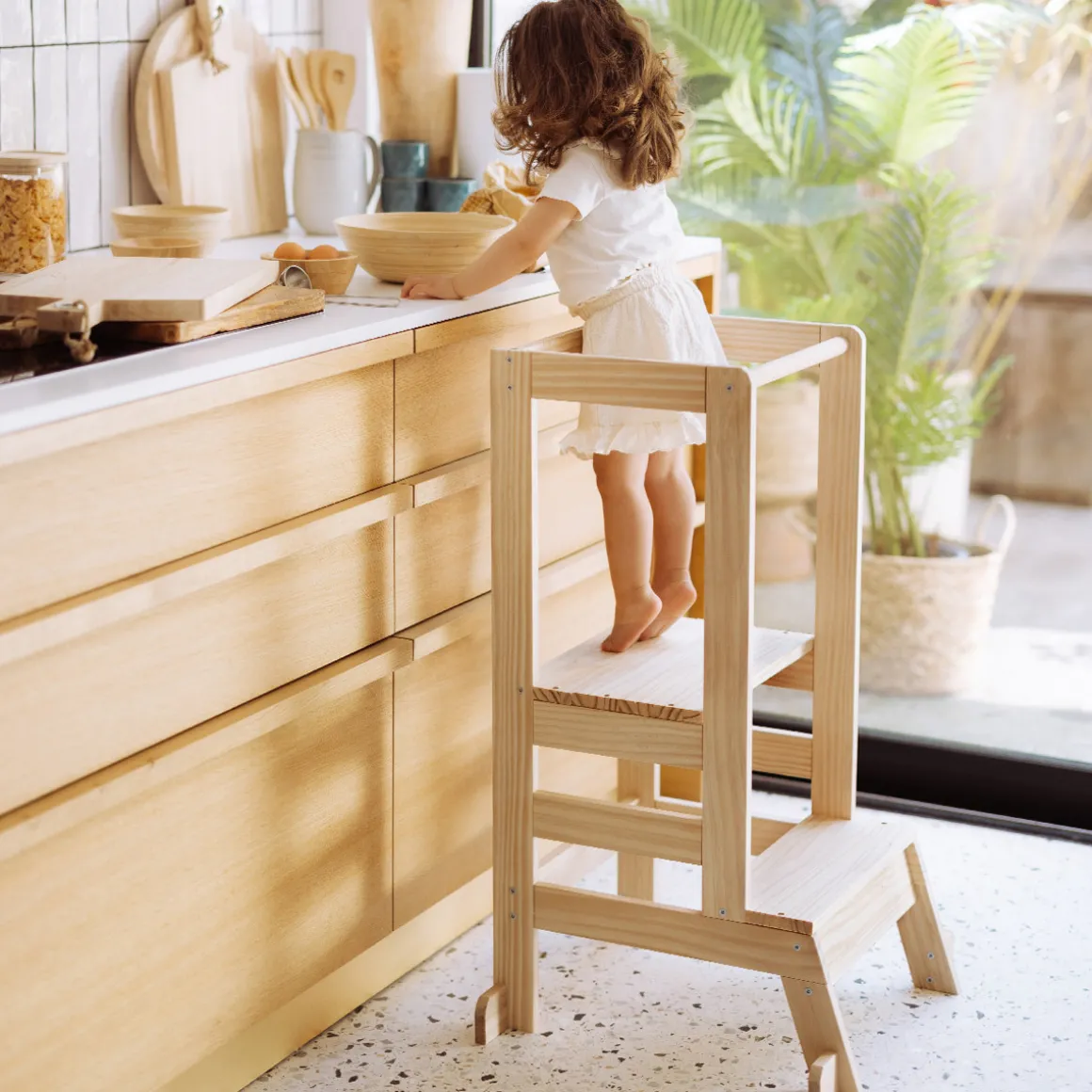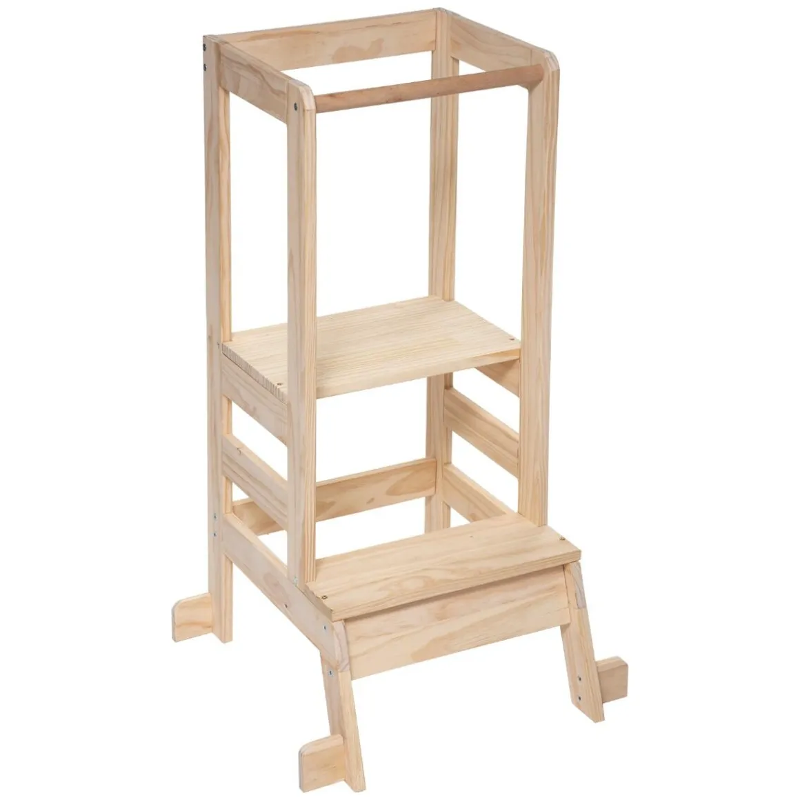 Sans aide, l’enfant se glisse sur la plateforme protégée par une rambarde fixe anti-chute. À monter soi-même, cette tour d’apprentissage en pin inspirée de la méthode Montessori est renforcée par 4 stabilisateurs à ses pieds pour une sécurité optimale.