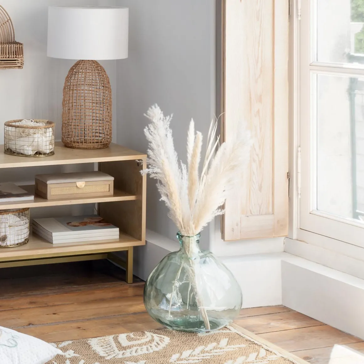 Avec sa belle contenance, ce vase rond mettra en valeur vos grandes fleurs à tige. Fabriqué en Espagne en verre recyclé, il s’insère avec style dans les décorations axées sur les matières naturelles. Il se présente sous la forme d’une bouteille ronde à la silhouette irrégulière avec le goulot légèrement penché.