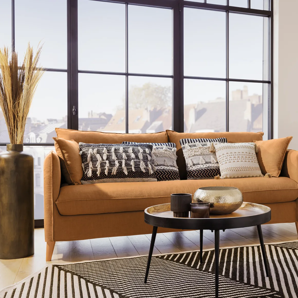 Pour une ambiance aux tendances d’ici et d’ailleurs, installez un grand tapis oriental, des rideaux en macramé et une décoration murale en rotin.