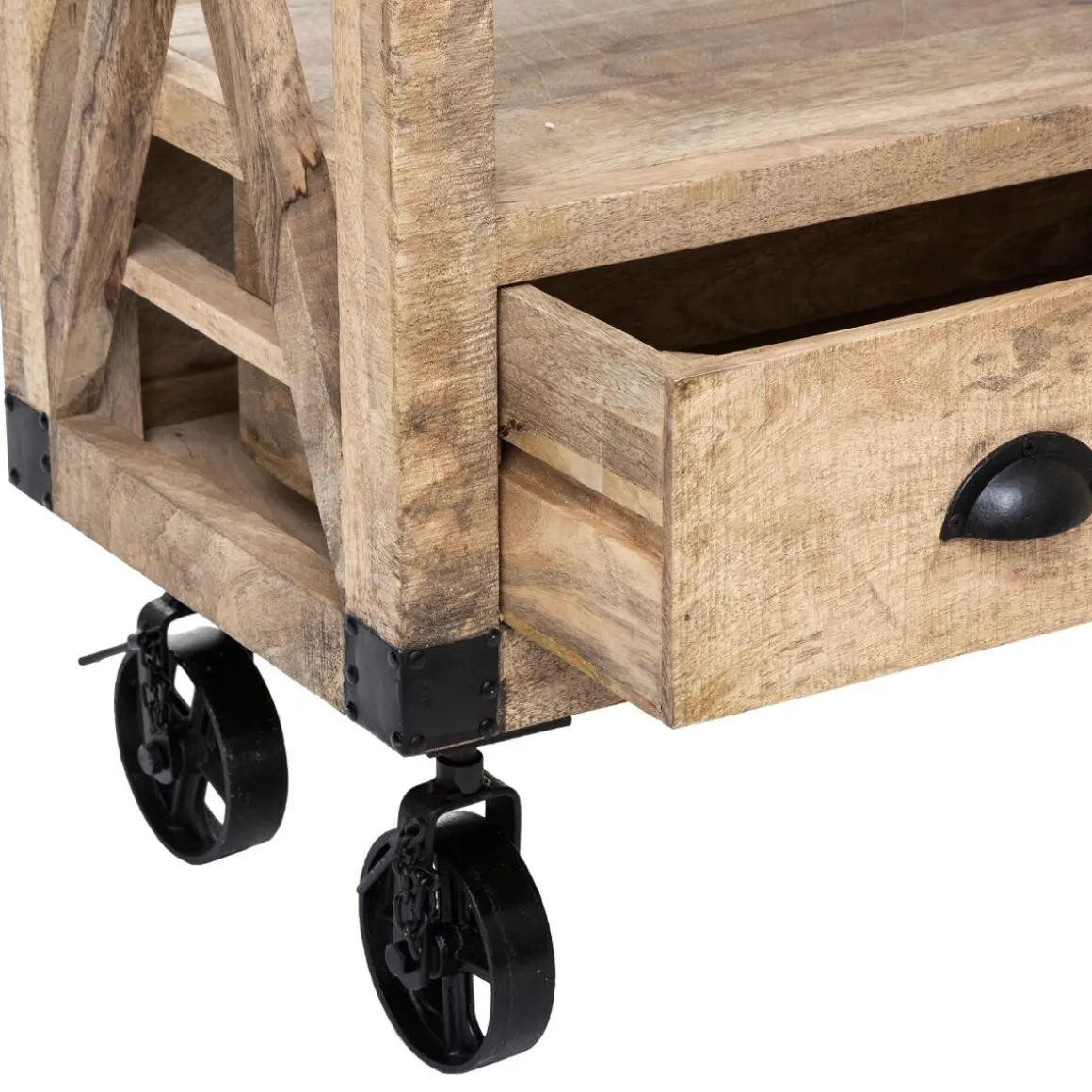 Dotée d’une structure en bois décorés de coins en acier, cette bibliothèque en manguier robuste est composée d’un large tiroir bas et de 4 étagères. Les poignées coquilles du tiroir et ses roues en métal lui offrent un style industriel tendance.