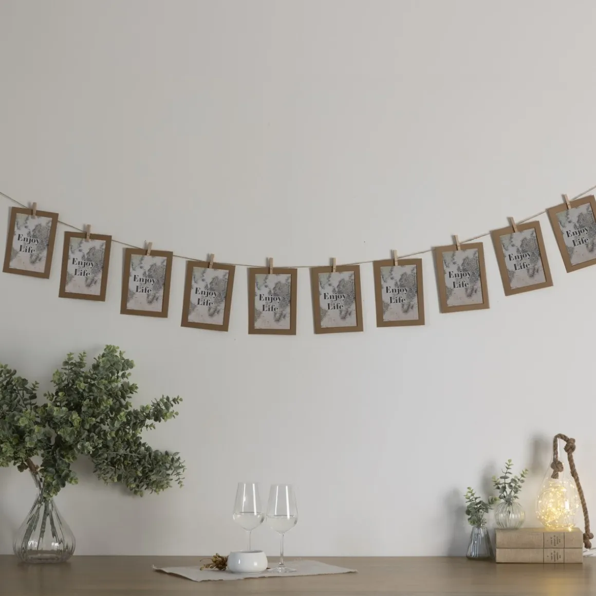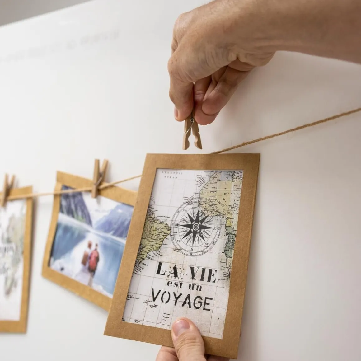 Les petites pinces fixées sur la corde en jute végétale se détachent. Elles servent à accrocher vos clichés en format portrait ou paysage en fonction de vos préférences. Vous pouvez également panacher les sens d’affichage pour donner un petit côté plus fun à l’ensemble.