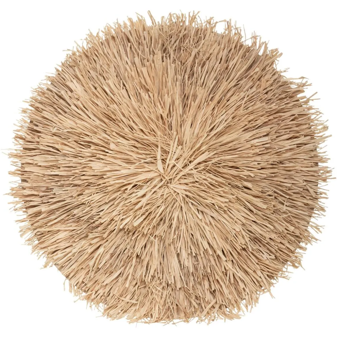 Le disque façon bois frangé de raphia de cette décoration murale surprend par sa singularité. Elle évoque l’artisanat des contrées hispaniques ensoleillées.