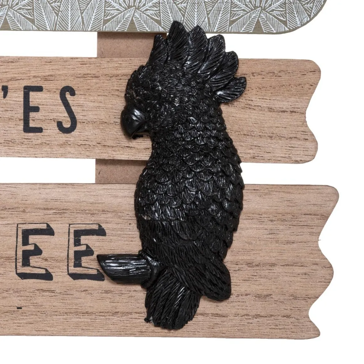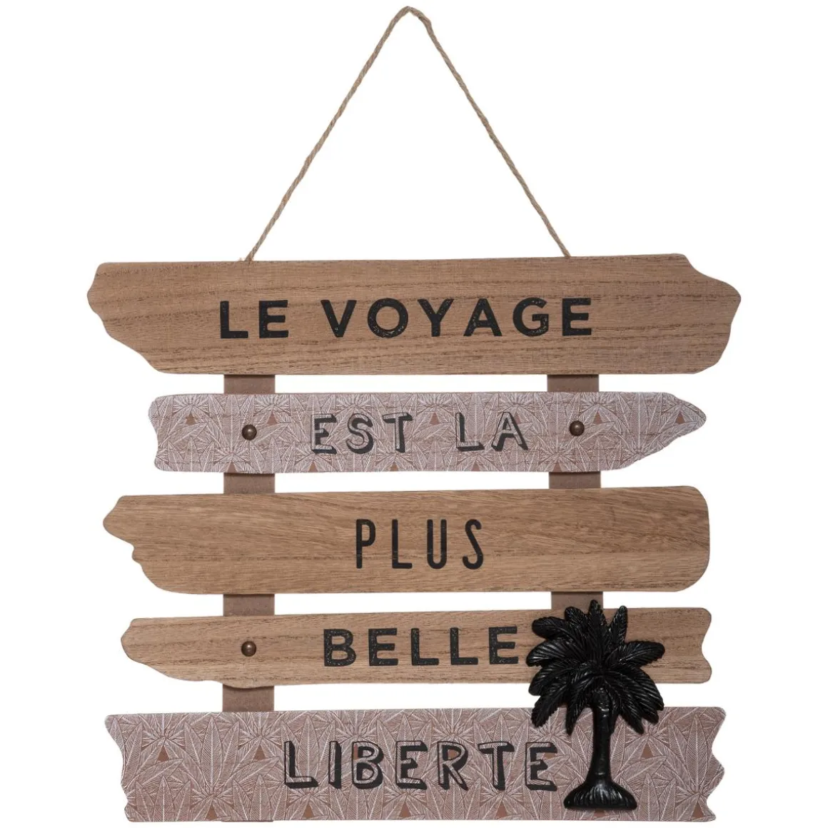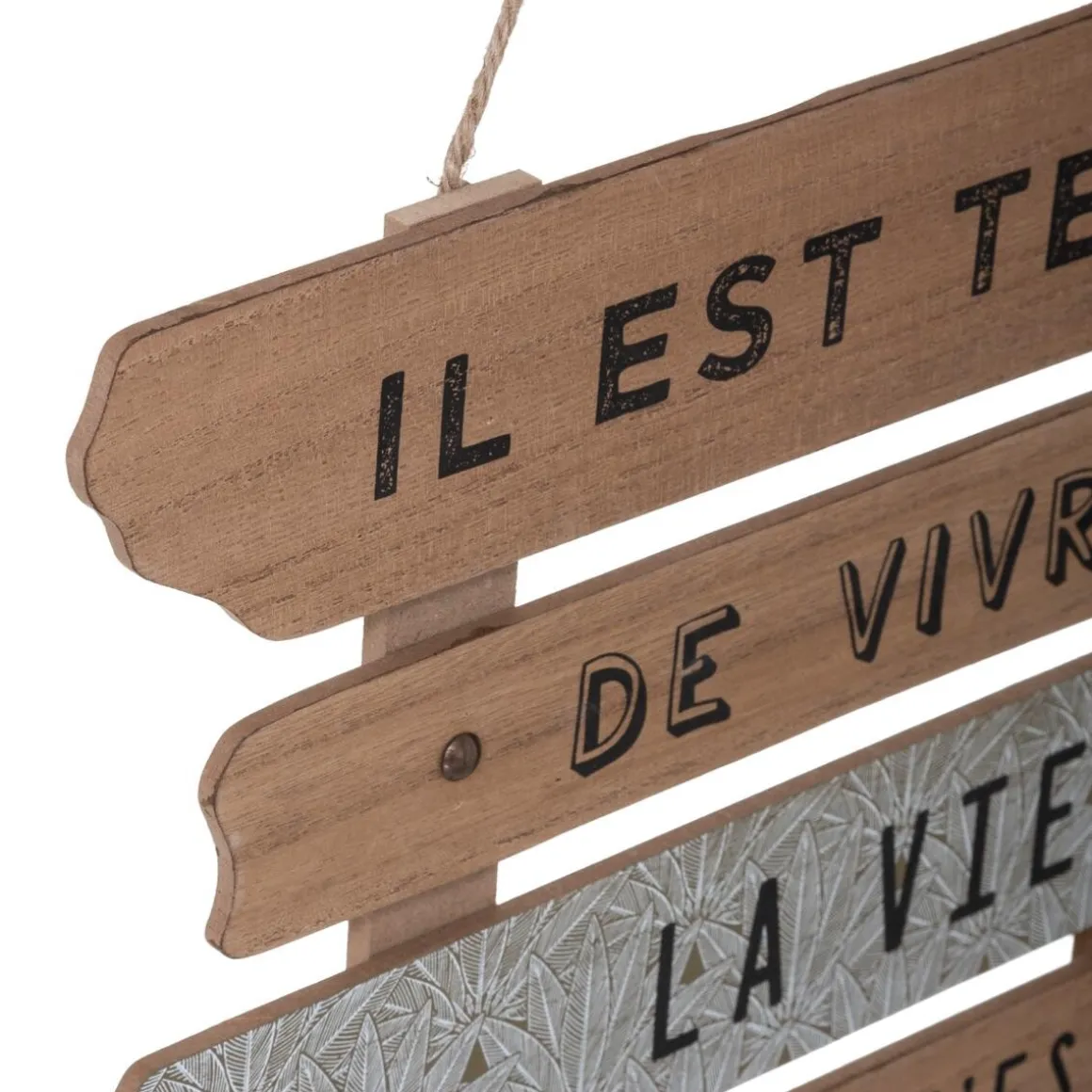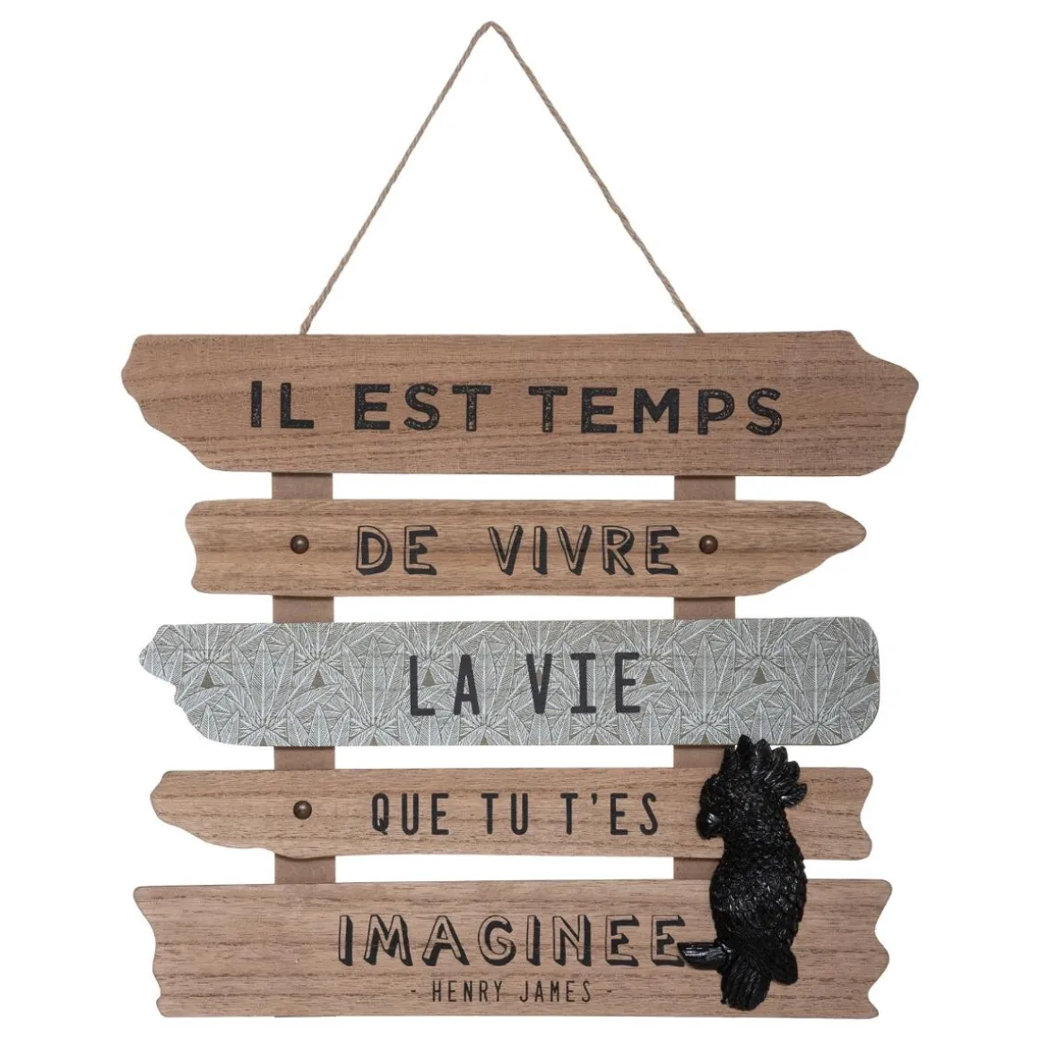 Cette déco murale « cuba » se compose de 5 planches en fibres de bois aux contours irréguliers qui confèrent à l’ensemble un style brut. Décoré d’une statuette en résine, cette déco est peinte d’un message en forme de mantra et se suspend grâce à une corde en chanvre. Quelques clous en métal viennent parfaire cet accessoire chaleureux!